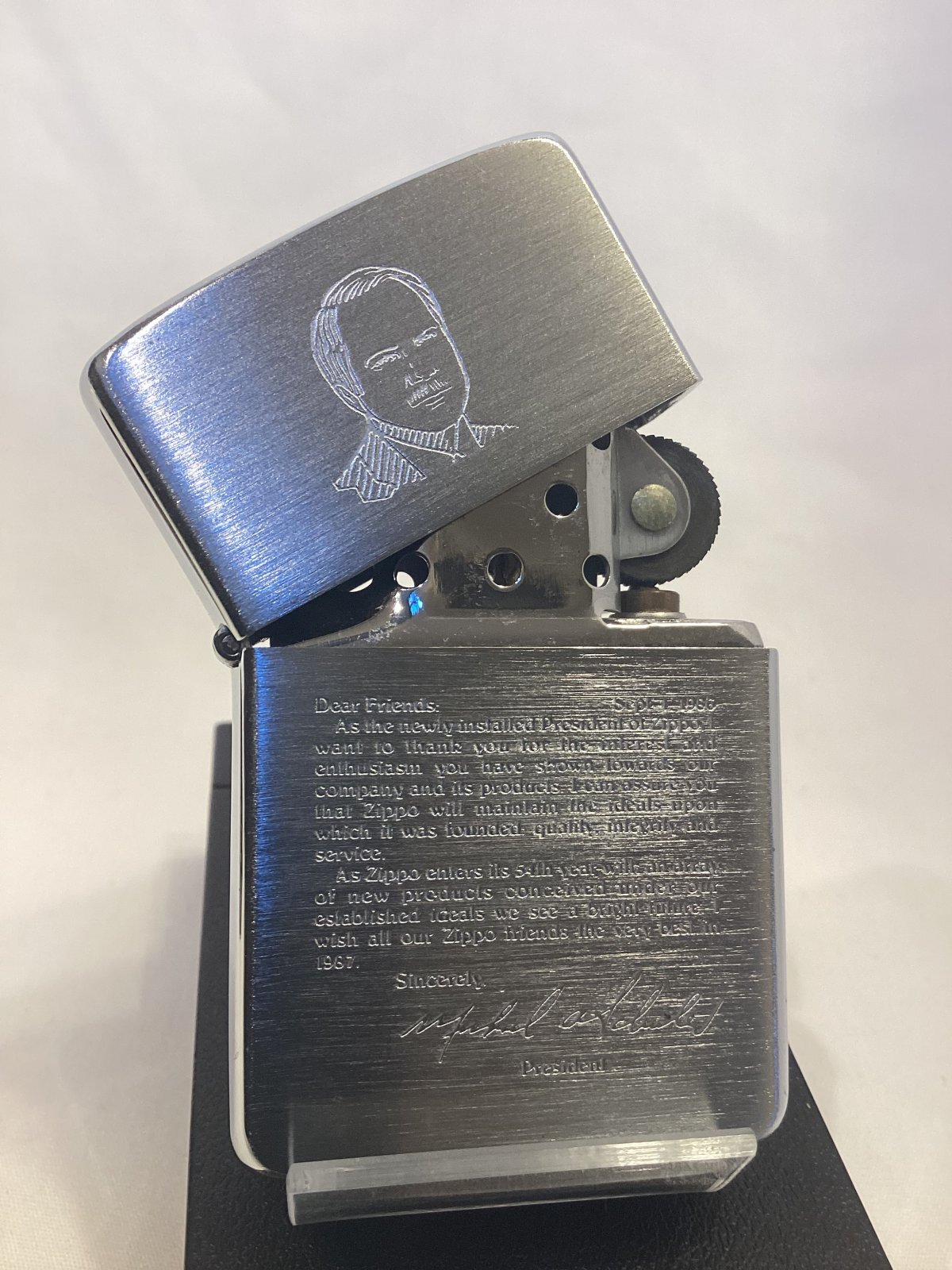 ☆ ジッポー社三代目社長「マイケル・A・シューラー」氏の顔のイラストとメッセージとサインがZIPPOに刻み込まれた、大変貴重な逸品です。